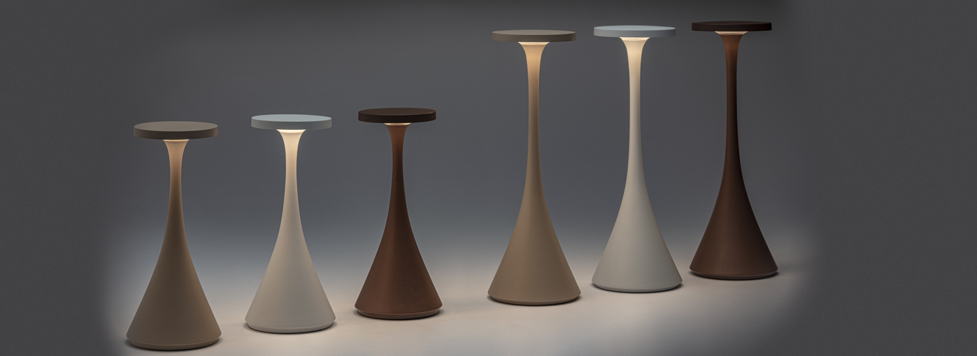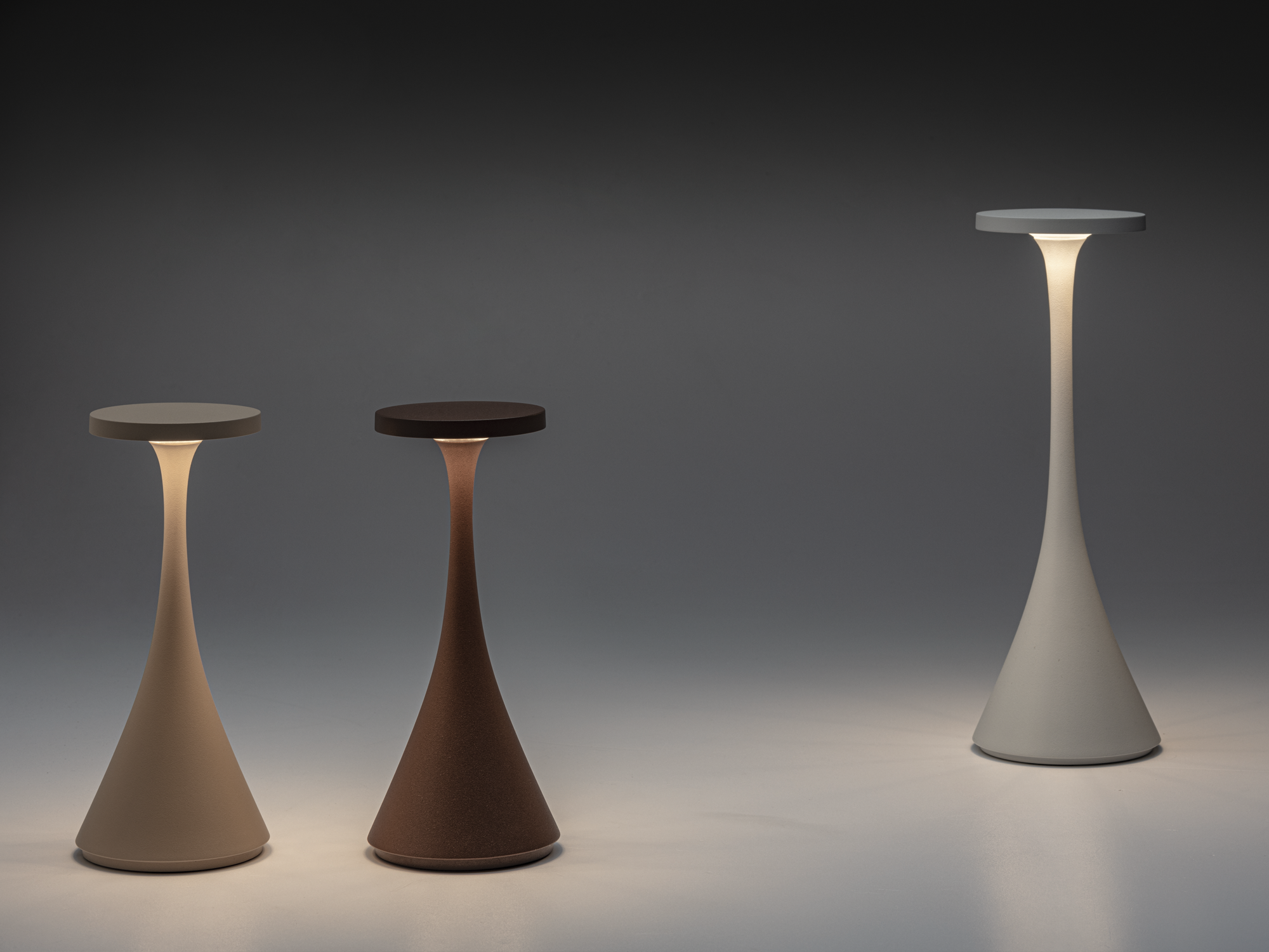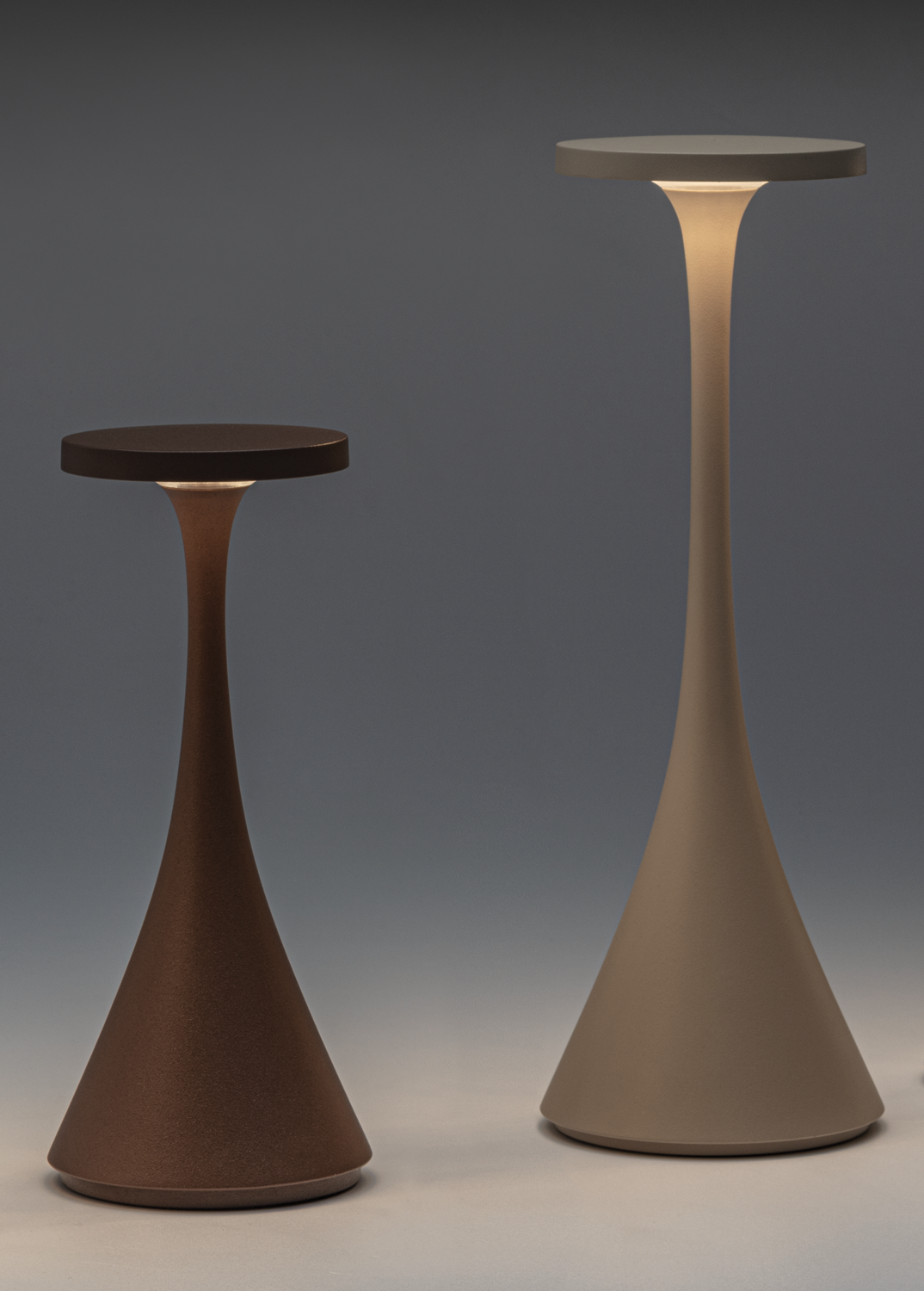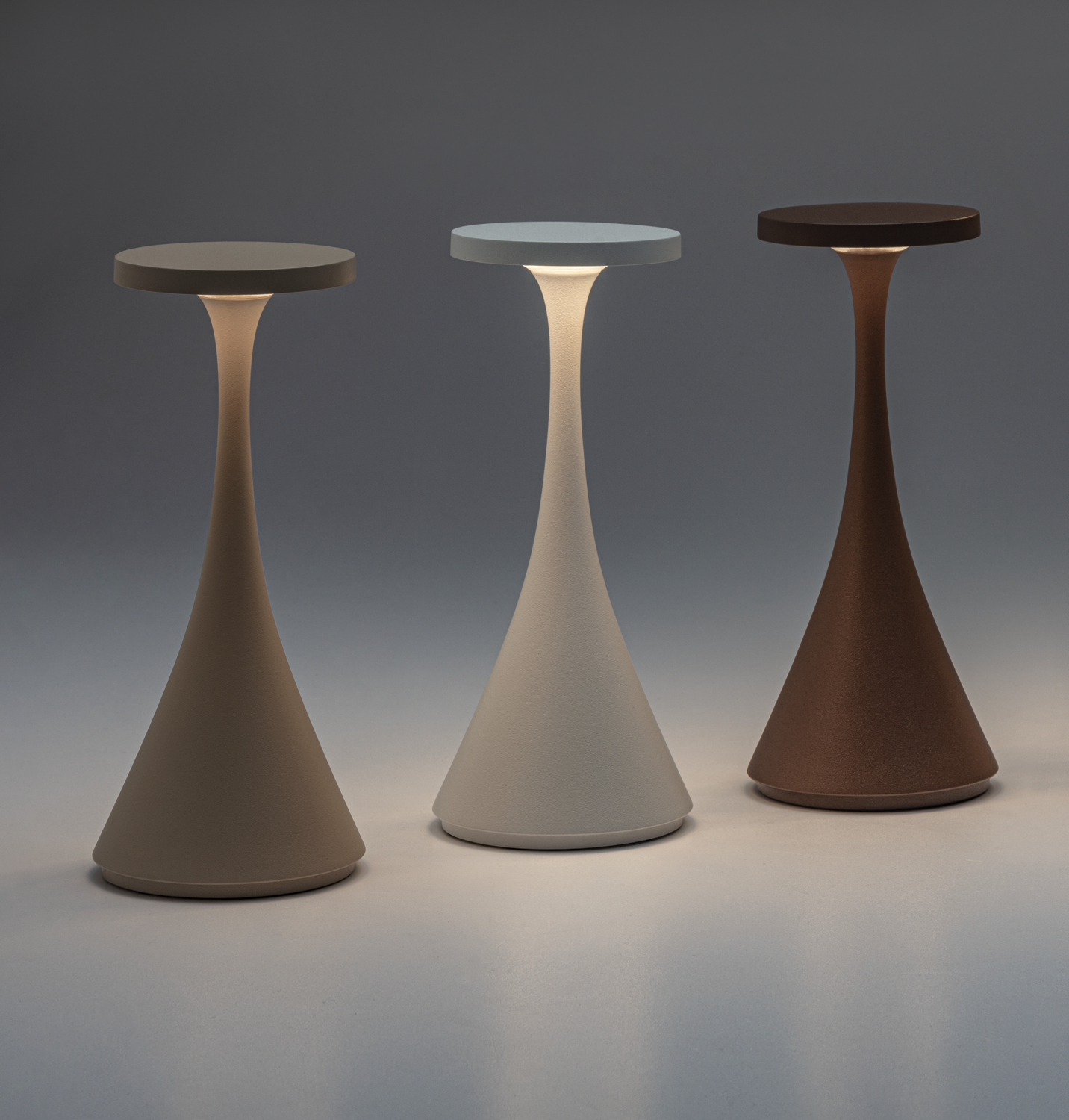 Lampada da tavolo per interni ed esterni, viene proposta in due misure: piccola e media. Perfetta per l’uso domestico è molto apprezzata nel mondo della ristorazione. L’emissione luminosa, con ottimo comfort visivo è priva di abbagliamento. Ha una serie di LED molto efficienti accoppiati ad una batteria al litio che garantisce lunghi periodi di funzionamento. La struttura è in pressofusione di alluminio verniciato ed usa un diffusore led in policarbonato. Le funzioni di accensione, regolazione dell’intensità luminosa e cambio del tono colore (bianco caldo- bianco freddo) si trovano nella parte superiore del riflettore. I sensori “soft touch” che gestiscono le varie funzioni non sono visibili. Ha funzione memoria: alla riaccensione viene proposto il livello luminoso precedentemente impostato. In dotazione una base di ricarica a contatto (220V AC) con cavo USB.