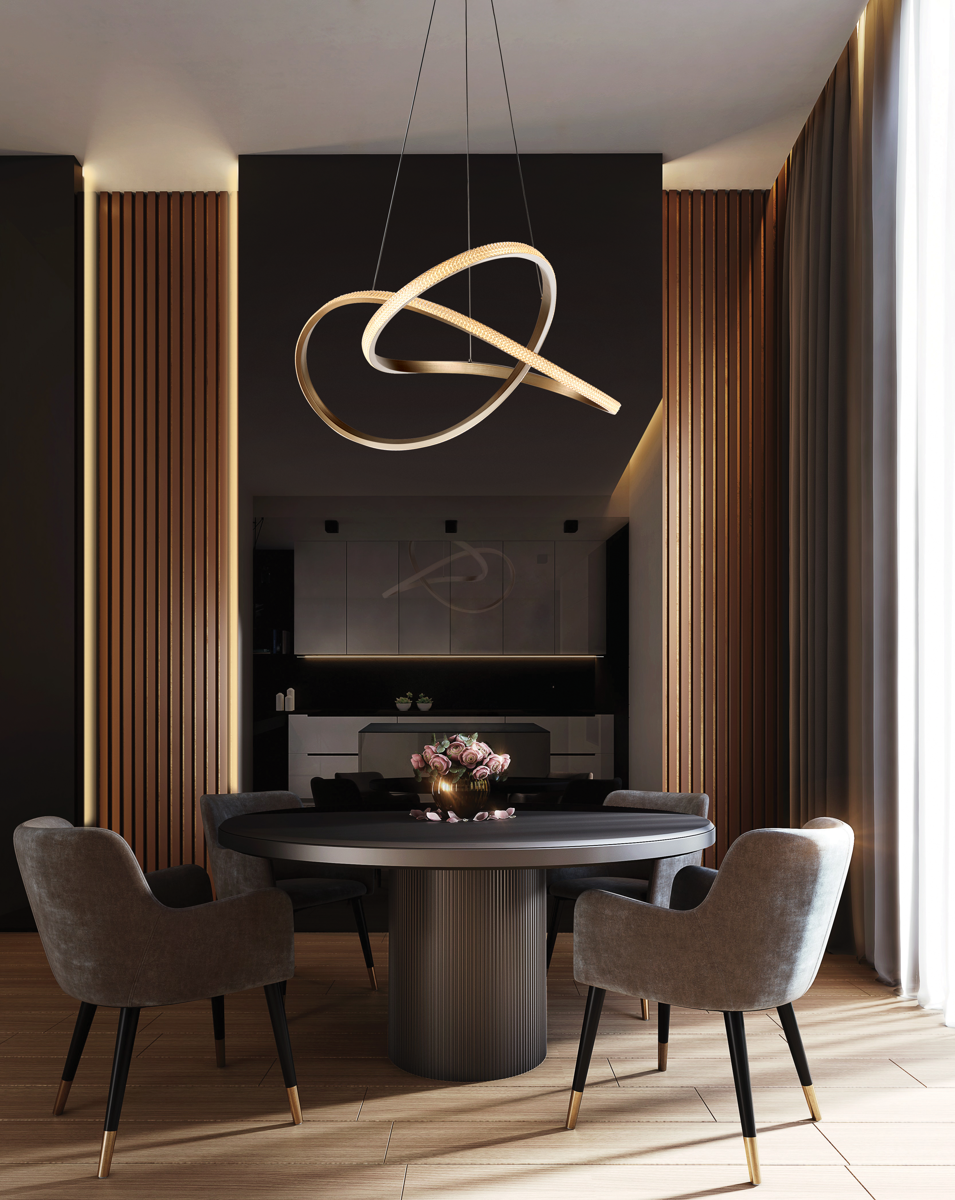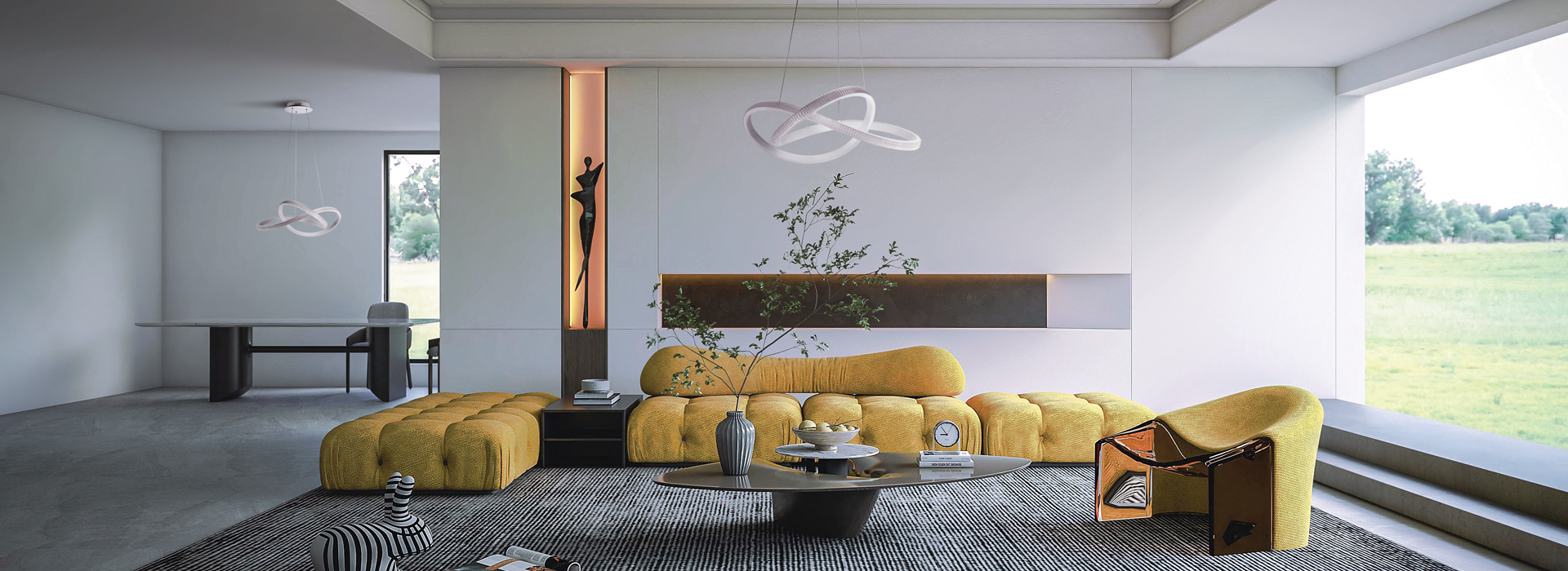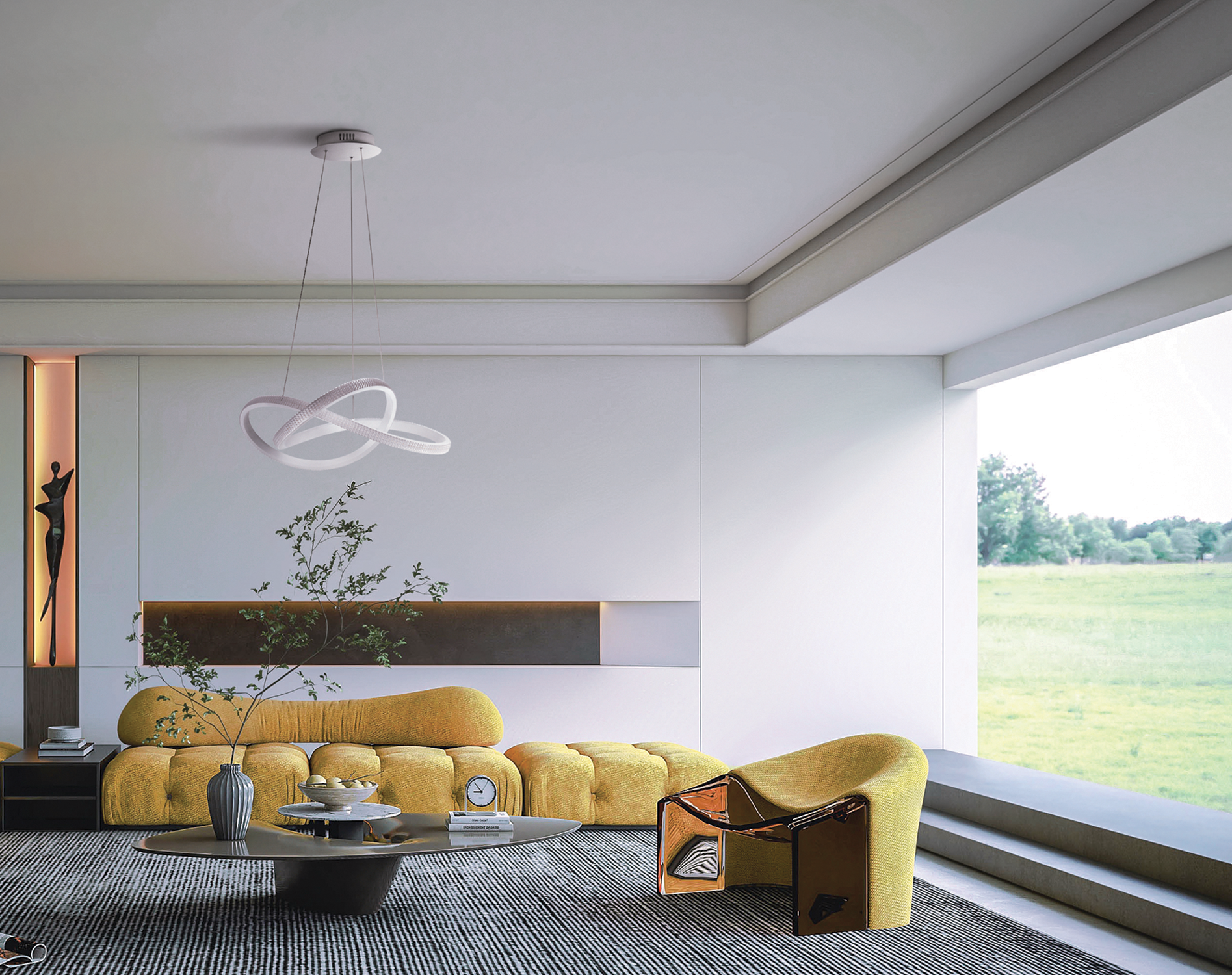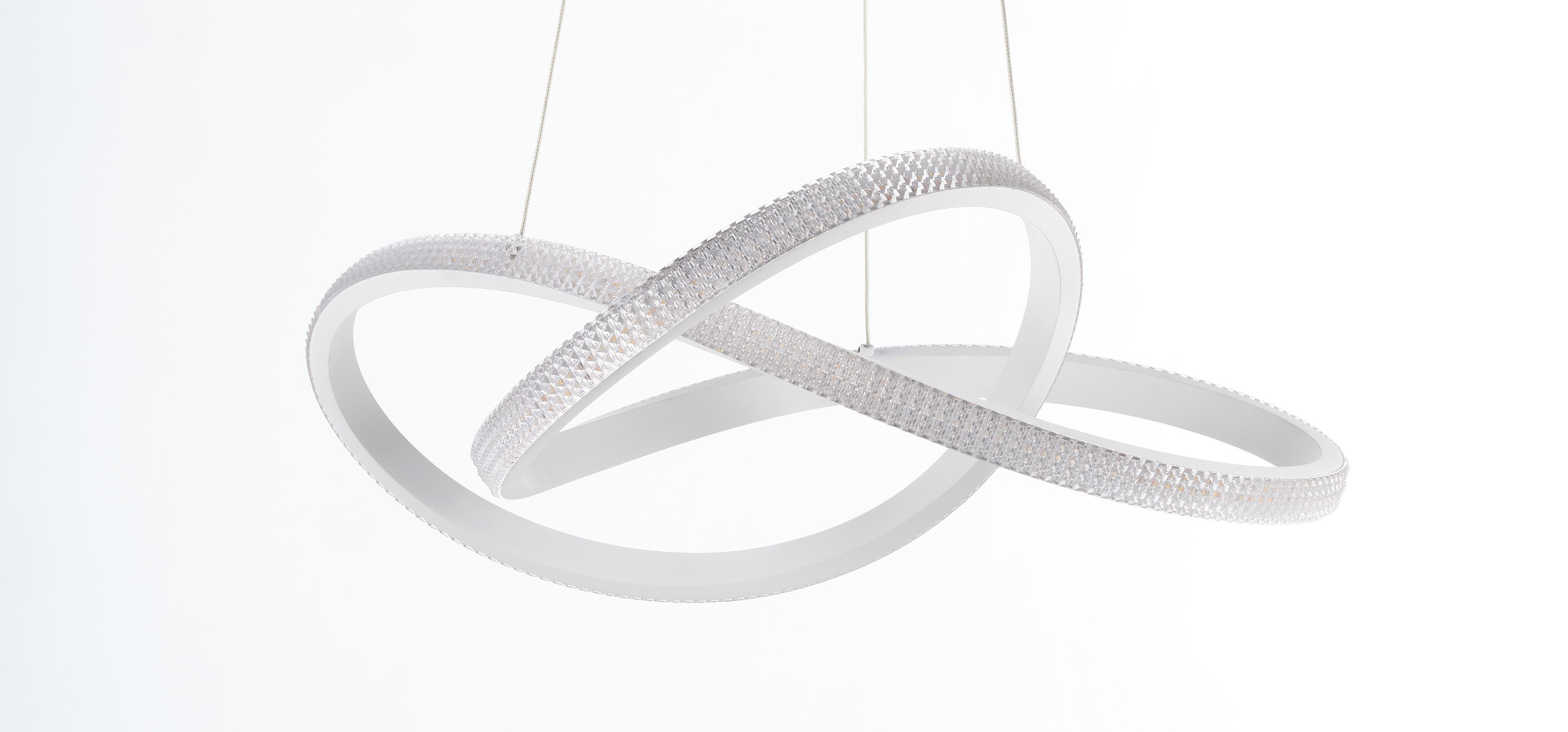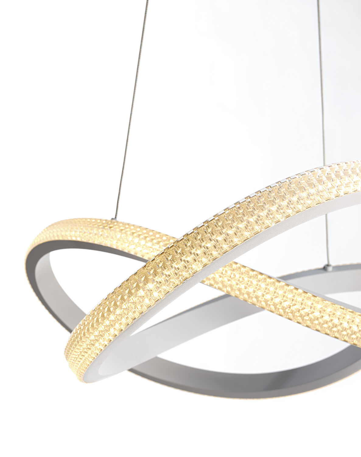 The crossed movements of the structure characterize the INFINITY models. An apparent formal simplicity becomes a prominent element in every installation. The lamp body is made of extruded aluminum, a polycarbonate screen with a special treatment maximizes light emission. Structure available in matt white or gold finish. The device is adjustable in height. The high efficiency driver is integrated in the ceiling rose. Multifunction dimmable versions with 1… 10V, Push, DALI control are available.