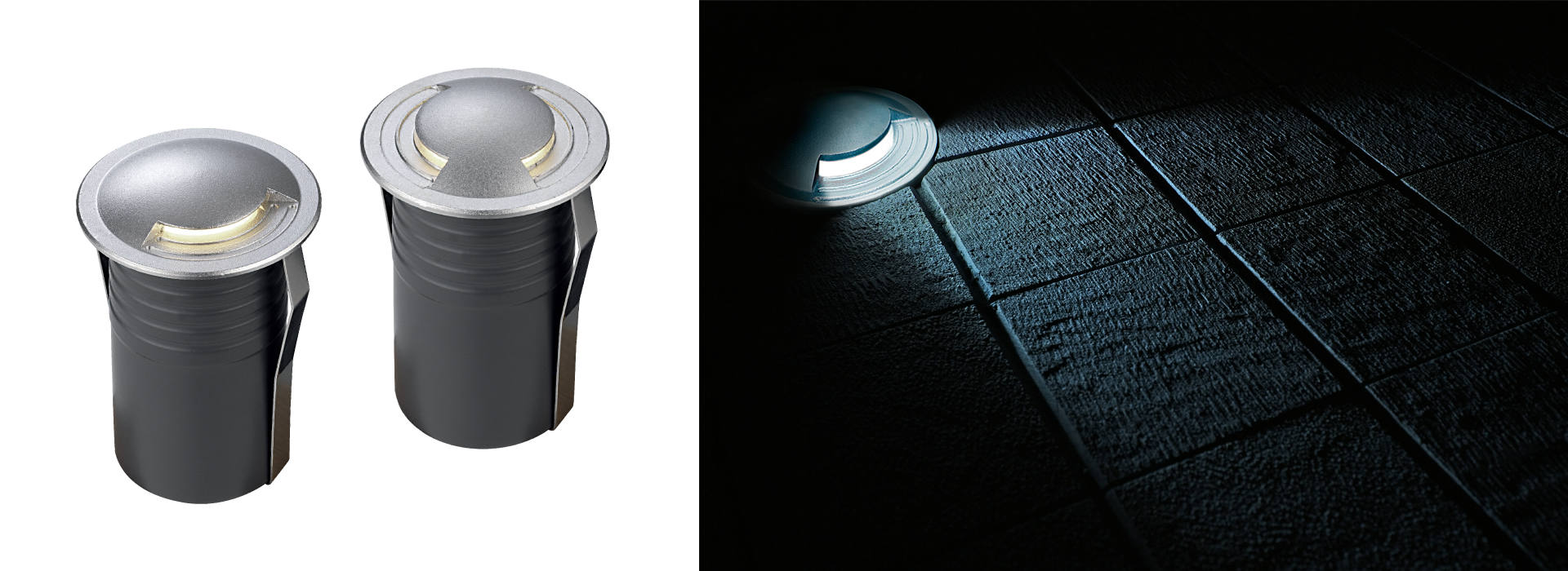 Gong is a recessed floor luminaire ideal for outdoor path lighting. Extremely compact, it is made of die-cast aluminum and can illuminate the ground with a beam of grazing light or in one direction or in two opposite directions; the rounded shape of the ring prevents accidental tripping and eliminates direct glare from the source. Gong is wired with a H05RN-F neoprene power cable 1 meter long and is supplied with a PVC sleever complete with cover cap, drilled for through-wiring both horizontally and vertically. The installation can be carried out without having to open the fixture, allowing the waterproofing conditions of the optical compartment to be maintained thus avoiding the formation of condensation inside.