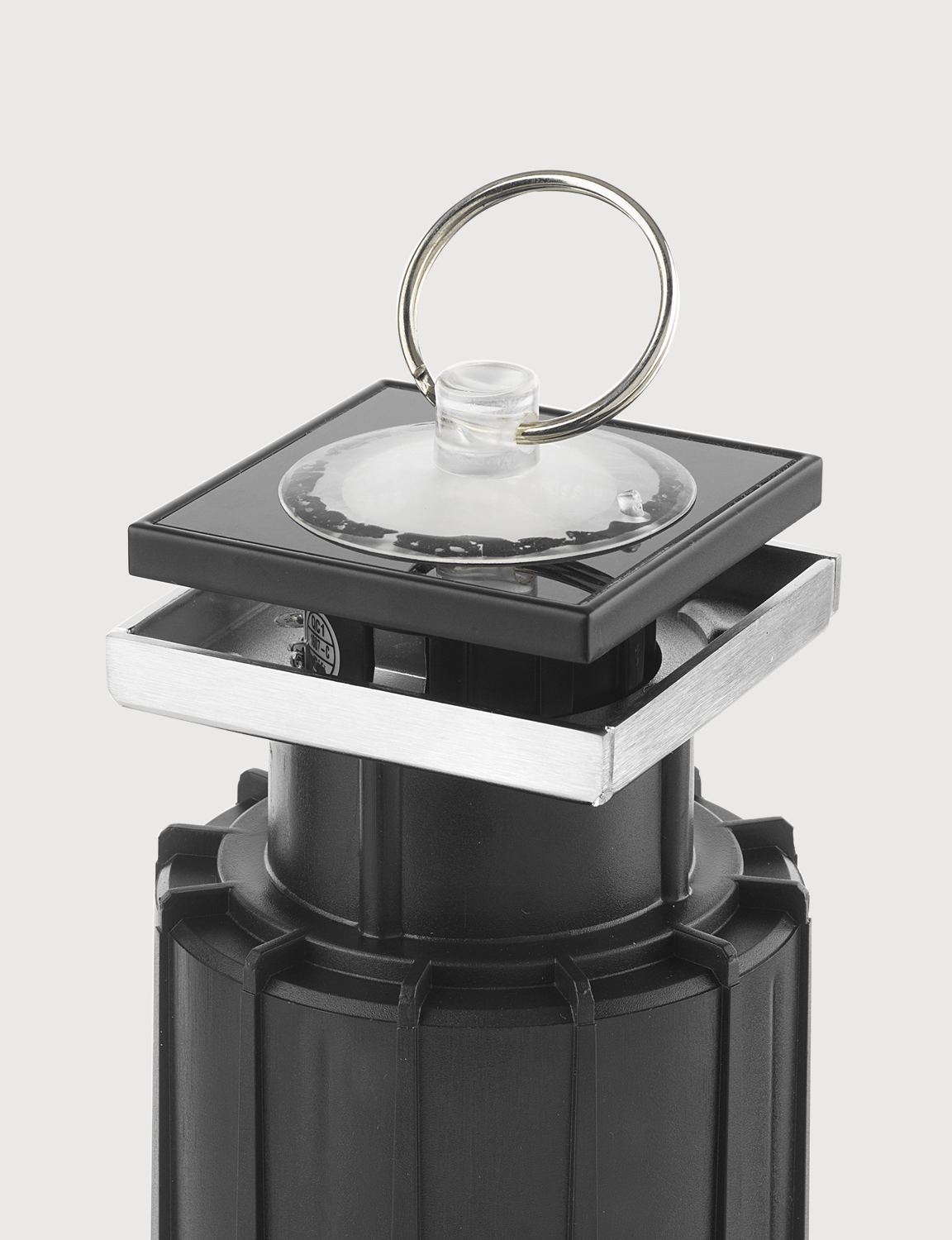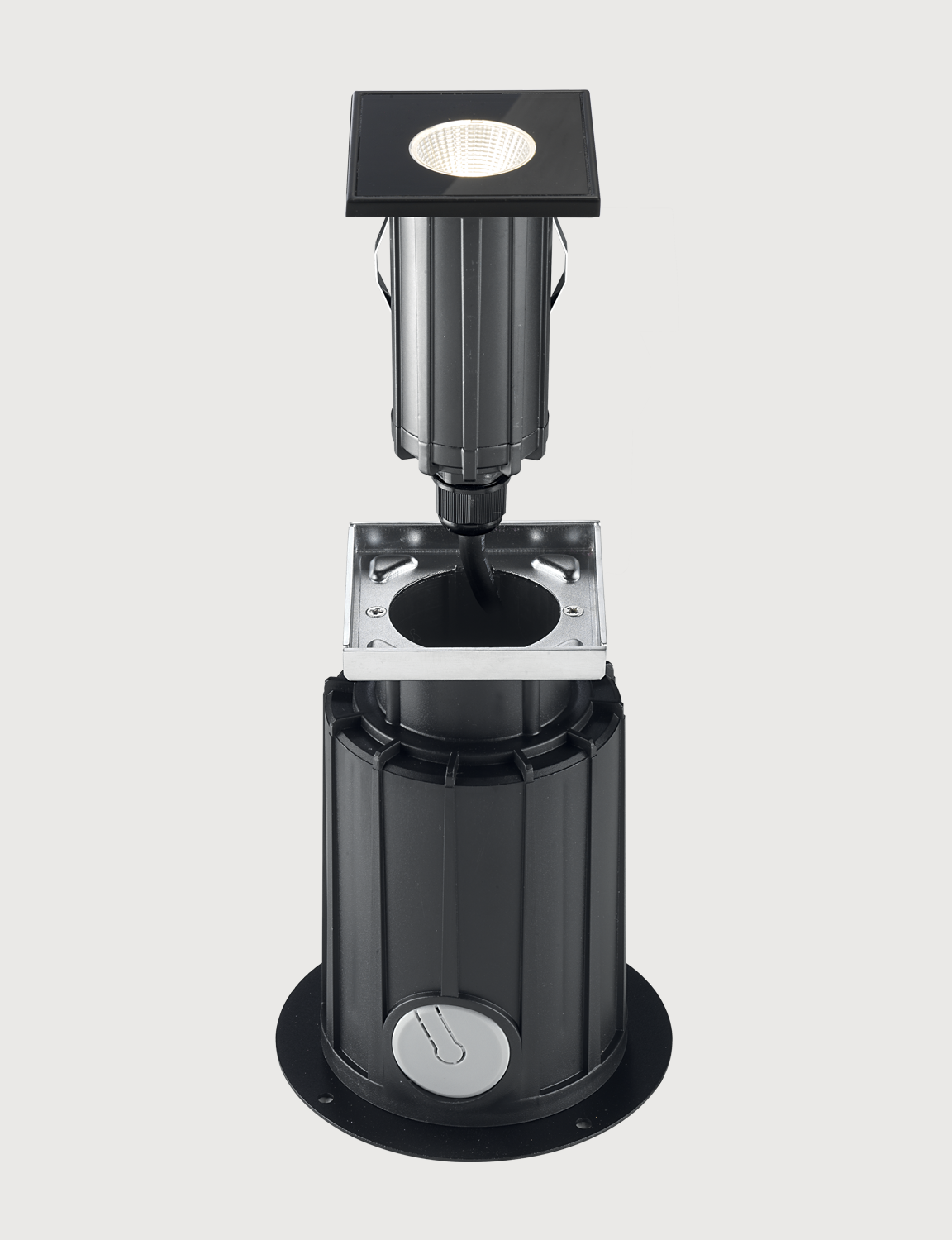 Hole Ground is a family of IP67 recessed luminaires ideal for lighting areas and outdoor paths. The luminaire body is made of die-cast painted aluminum and complete with front made of transparent tempered glass 4 mm. thick; the surface below the front part is painted in matt white or matt black, and characterizes the aesthetic appearance of the fixture once installed. The body of Hole Ground is installed perfectly flush with the ground by staying in a special steel housing, made in the sleever supplied. The fixture is wired with a H05RN-F 3x 1.0 mm2 neoprene power cable 40 cm. meter length.