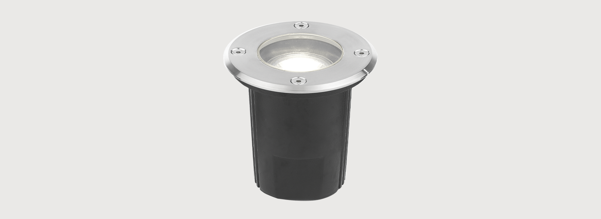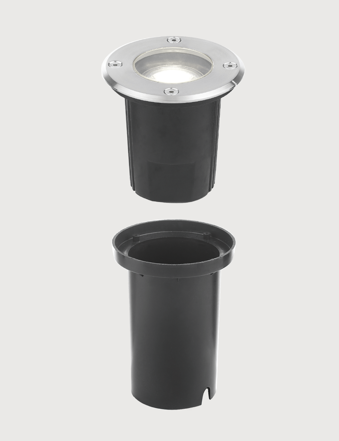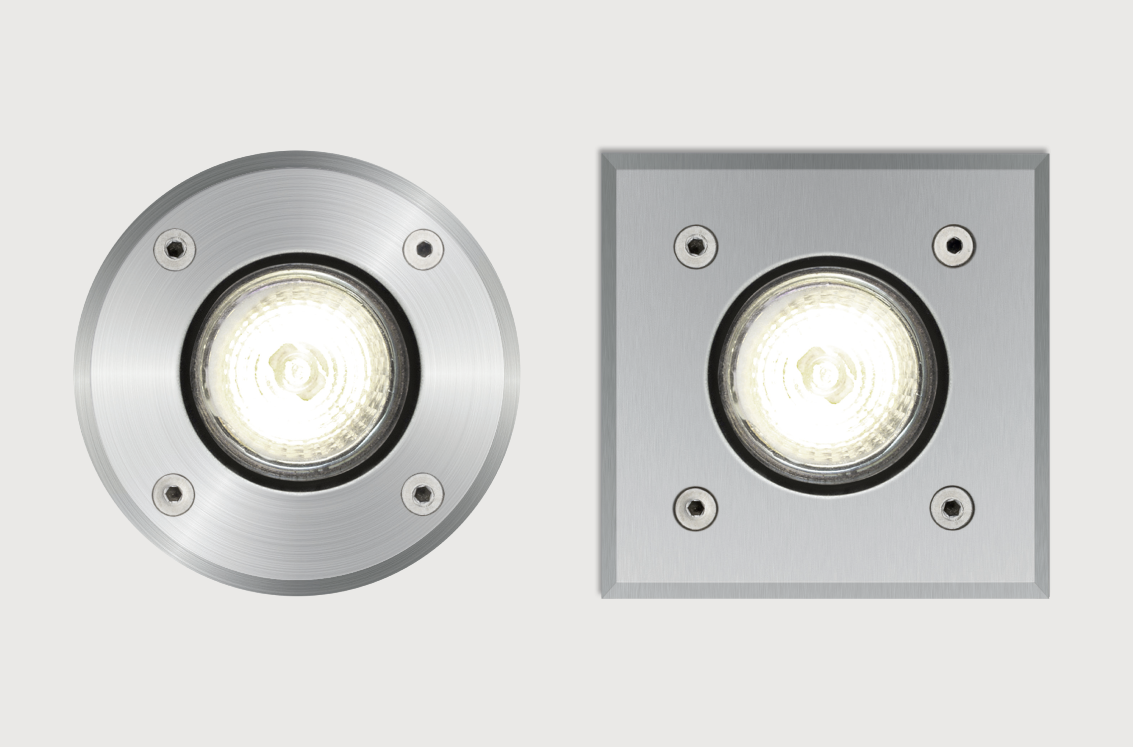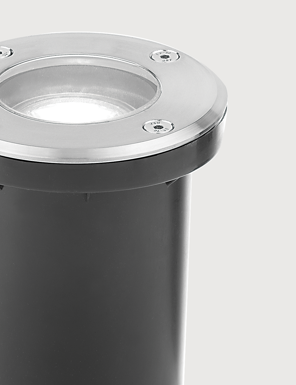 King is a walkable recessed floor fixtures ideal for outdoor installations; complete with round or square AISI 304 stainless steel ring, particularly thin and with flared edge to prevent accidental tripping. Its GU10 socket allows the use of interchangeable LED lamps (not included) by choosing the opening beam according to the selected source. The tightness of the fixture is guaranteed by the coupling between the ring and the body obtained with four allen screws which guarantee the waterproofness of the optical compartment even after changing the lamp. The high build quality and interchangeability of the lamp make King a particularly long-lasting luminaire. King is supplied with the relative PVC cockpit.