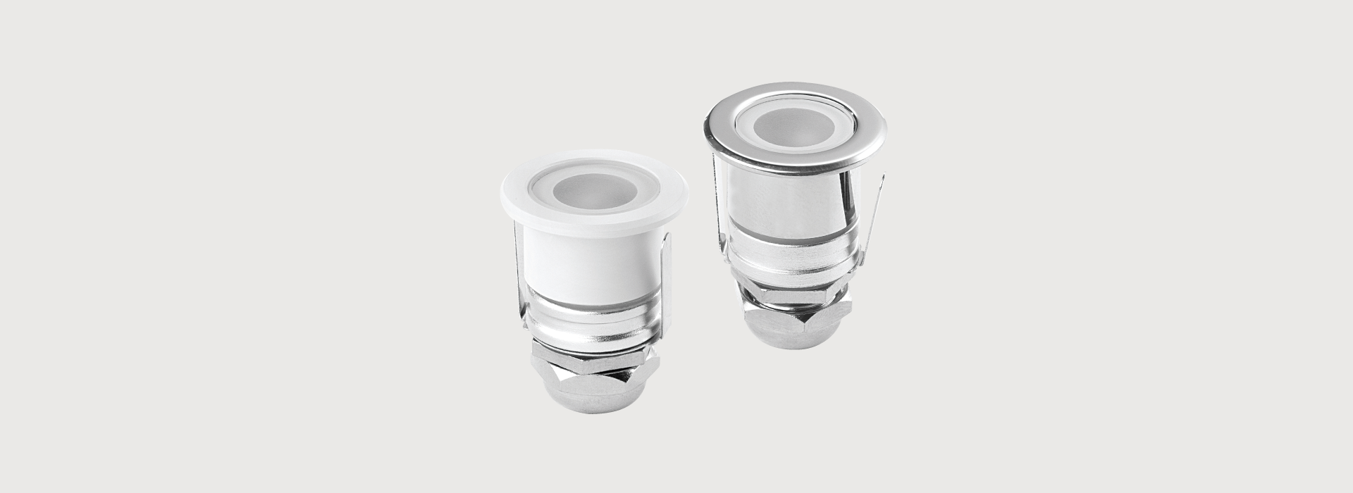 Einbaulampe, begehbar und wasserdicht für Innen- und Außenbeleuchtung aus Aluminium mit Frontalring aus AISI 304-Stahl. Leicht satiniertes Schutzglas. Ein komplettes Montageset wird geliefert, das die Fixierung mit Gewindering oder Feder aus Stahl auf den Abdeckungen und PBTSchale zum Anbringen an der Mauer vorsieht.