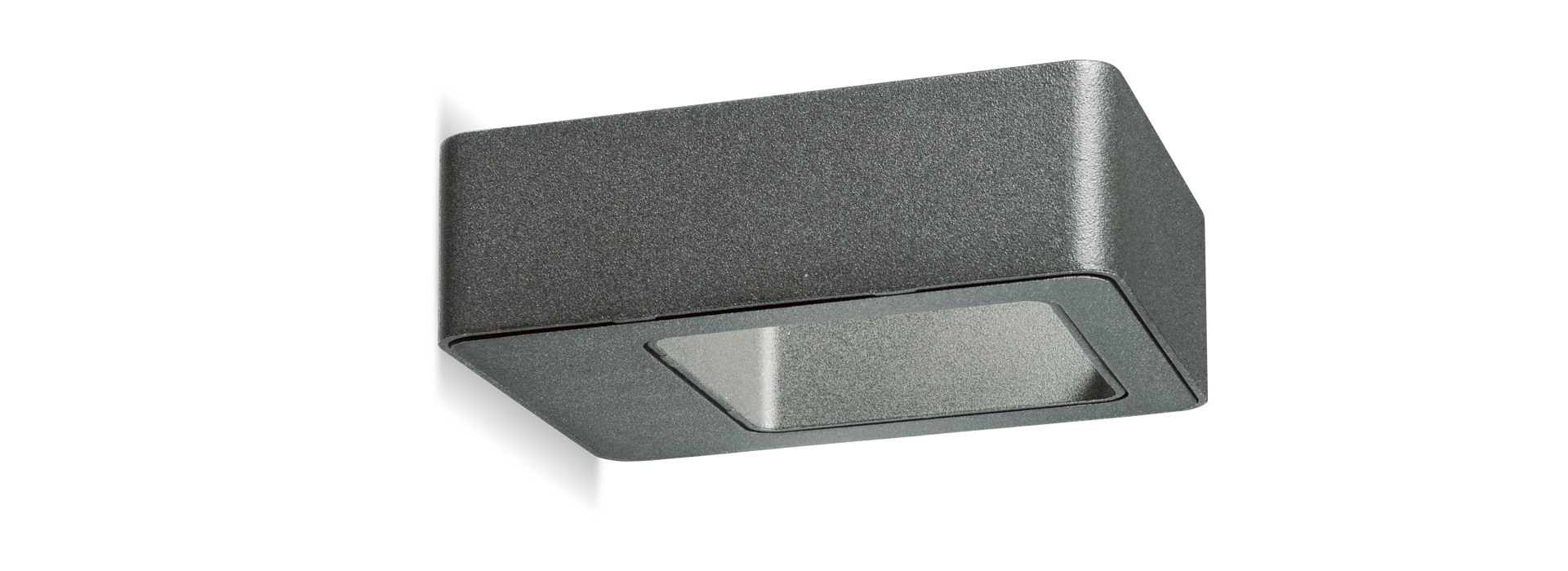 Outdoor wall-mounted luminaire. Painted aluminium body. Integrated high efficiency LED light source. Direct emission downwards. Electronic driver integrated in the fixture. IP54 protection.