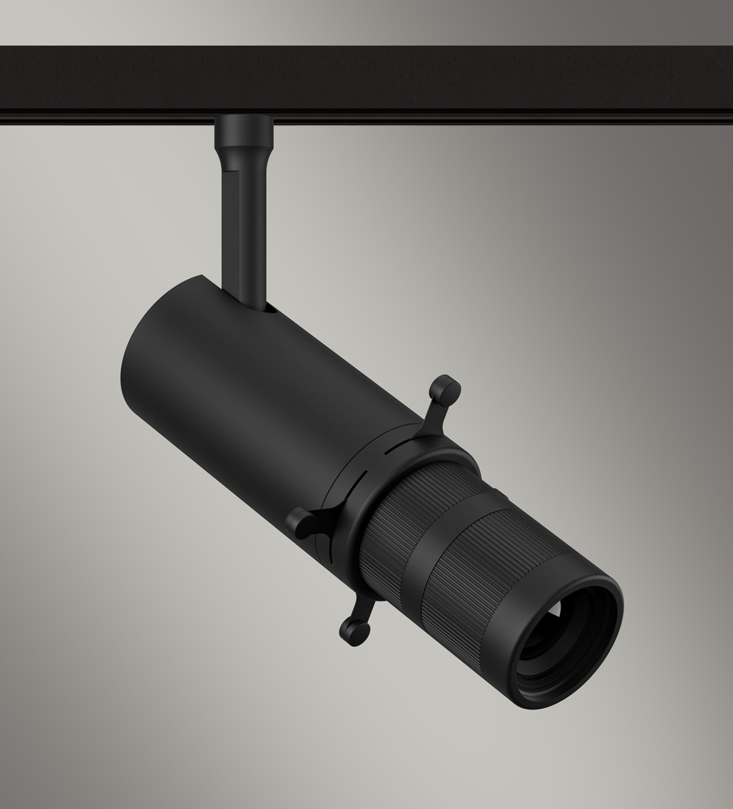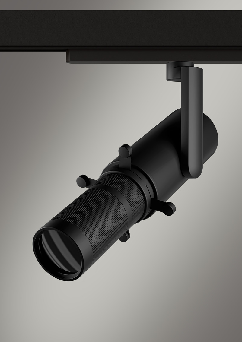 Il sistema zoom permette di variare rapidamente l’ampiezza del fascio luminoso, da un’illuminazione concentrata a una più diffusa, con un semplice gesto. Il sagomatore a 4 lame consente di delimitare con estrema precisione l’area di proiezione, incorniciando opere, pannelli o dettagli architettonici con contorni netti e definiti. La possibilità di trasformare la distribuzione della luce, passando da un fascio regolare a una sagomatura mirata, rende SAGO uno strumento versatile e indispensabile nelle esposizioni temporanee e negli allestimenti dinamici.